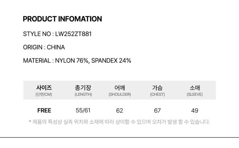 | 1. 제품 소재 (섬유의 조성 또는 혼용률을 백분율로 표시, 기능성인 경우 성적서 또는 허가서) | 겉감:나일론 76%, 폴리우레탄 24% |