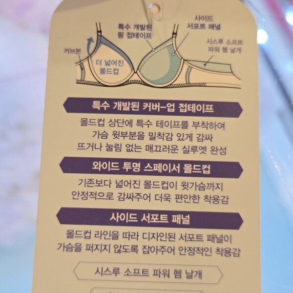한겹의 얇고 투명한 스페이서를 몰딩 처리한브라컵을 사용하여?흡한속건?및?형태안정성을 준 브라로 더 넓어진 투명 스페이서 몰드 컵을 사용하고 특수 개발된 커버-업 접테이프를 컵 상변에 부착하여 뜨거나 눌림없는 매끈한 실루엣을?완성해 주는 제품