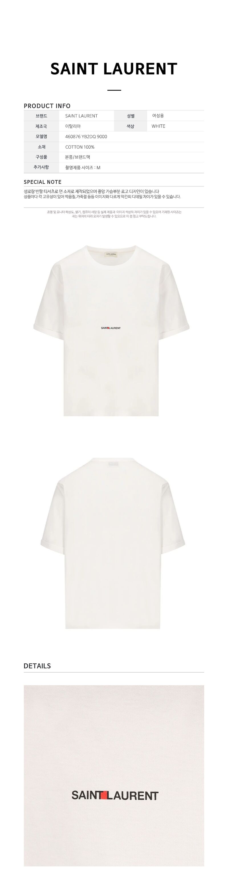 [명품] 생로랑 여성 로고 프린팅 코튼 반팔 티셔츠 화이트 460876 YB2DQ 9000