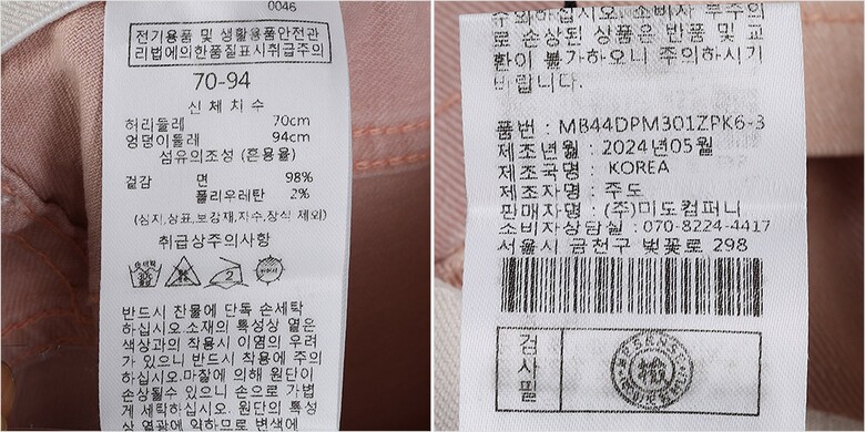 | 1. 제품 소재 (섬유의 조성 또는 혼용률을 백분율로 표시, 기능성인 경우 성적서 또는 허가서) | 겉감-면98% 폴리우레탄2% |