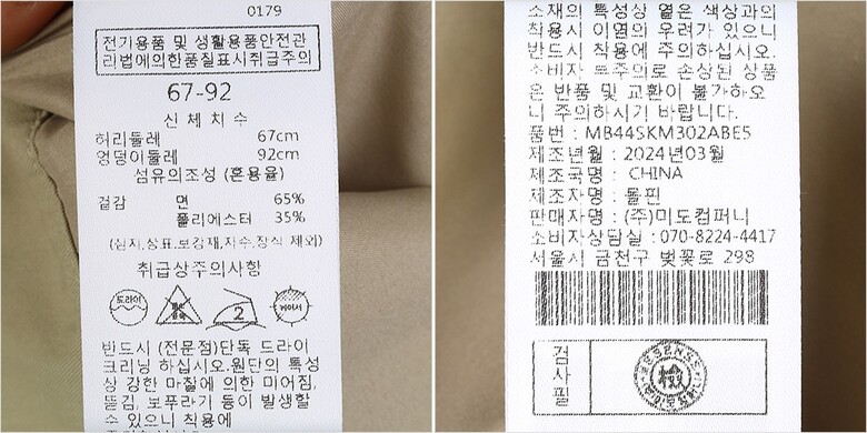 | 6. 세탁방법 및 취급시 주의사항 | 상세페이지 참조 |