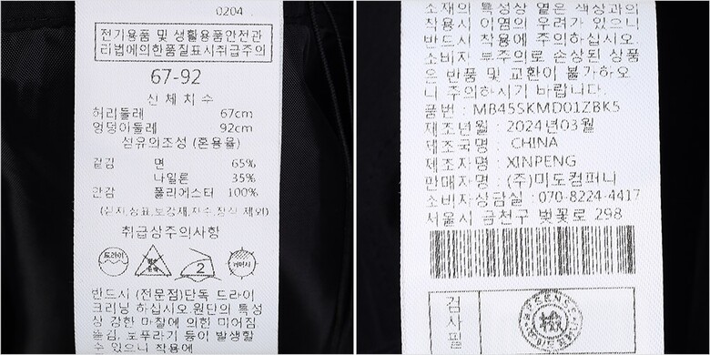 | 1. 제품 소재 (섬유의 조성 또는 혼용률을 백분율로 표시, 기능성인 경우 성적서 또는 허가서) | 겉감-면65% 나일론35% 안감-폴리에스터100% |