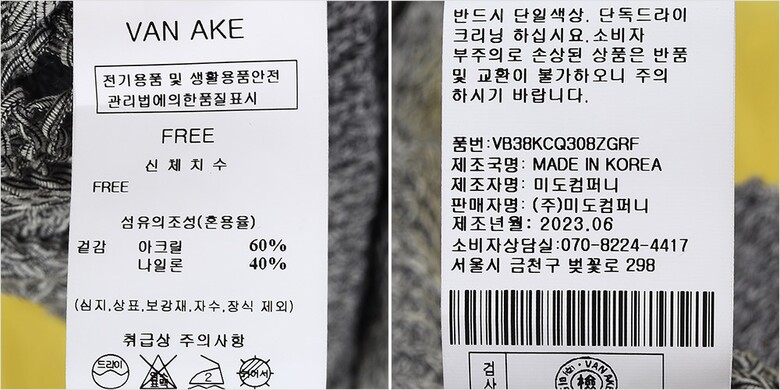 | 1. 제품 소재 (섬유의 조성 또는 혼용률을 백분율로 표시, 기능성인 경우 성적서 또는 허가서) | 겉감-나일론40% 아크릴60% |