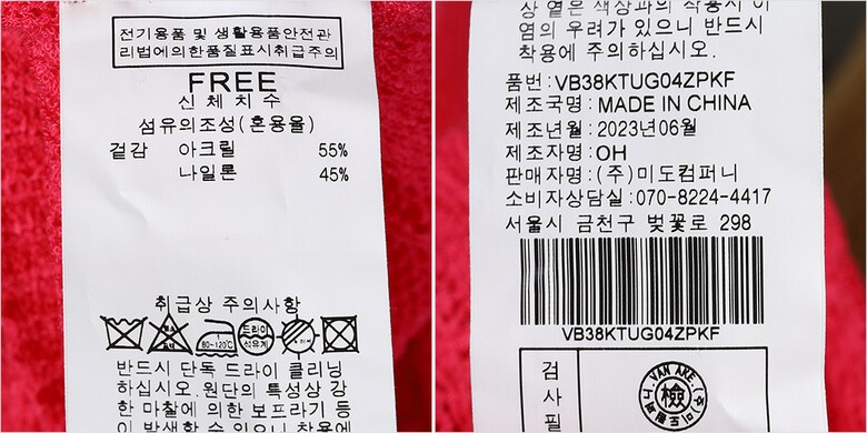 | 1. 제품 소재 (섬유의 조성 또는 혼용률을 백분율로 표시, 기능성인 경우 성적서 또는 허가서) | 겉감-나일론45% 아크릴55% |