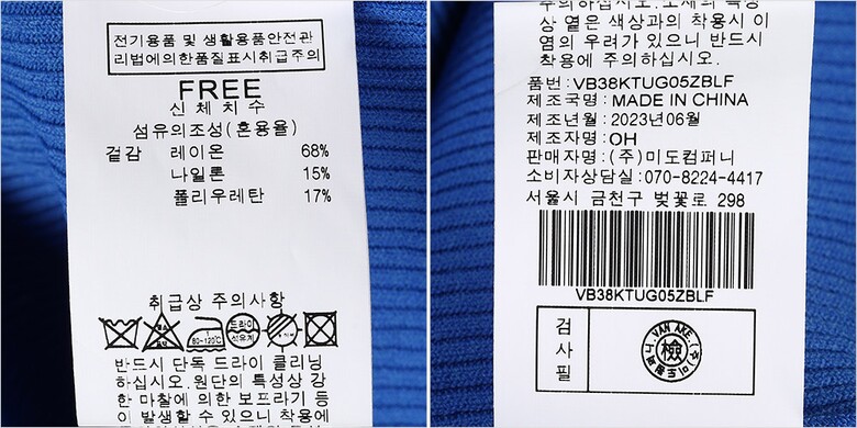 | 1. 제품 소재 (섬유의 조성 또는 혼용률을 백분율로 표시, 기능성인 경우 성적서 또는 허가서) | 겉감-폴리우레탄17% 나일론15% 레이온68% |