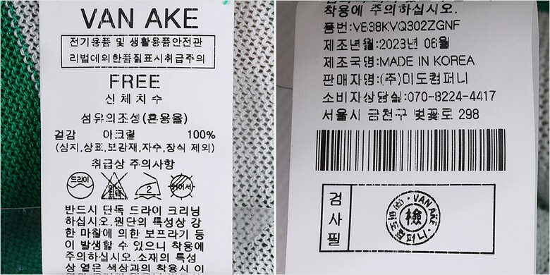 | 1. 제품 소재 (섬유의 조성 또는 혼용률을 백분율로 표시, 기능성인 경우 성적서 또는 허가서) | 겉감-아크릴100% |