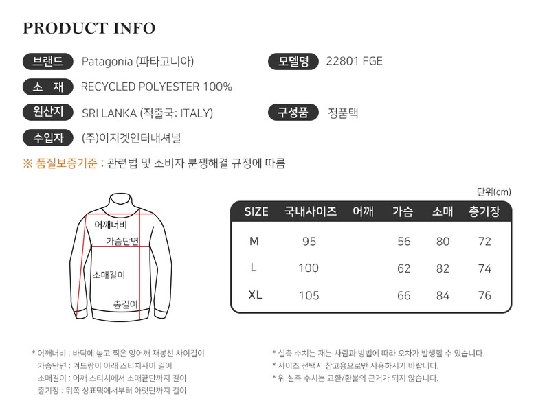 | 1. 제품 소재 (섬유의 조성 또는 혼용률을 백분율로 표시, 기능성인 경우 성적서 또는 허가서) | 상세페이지 참조 |