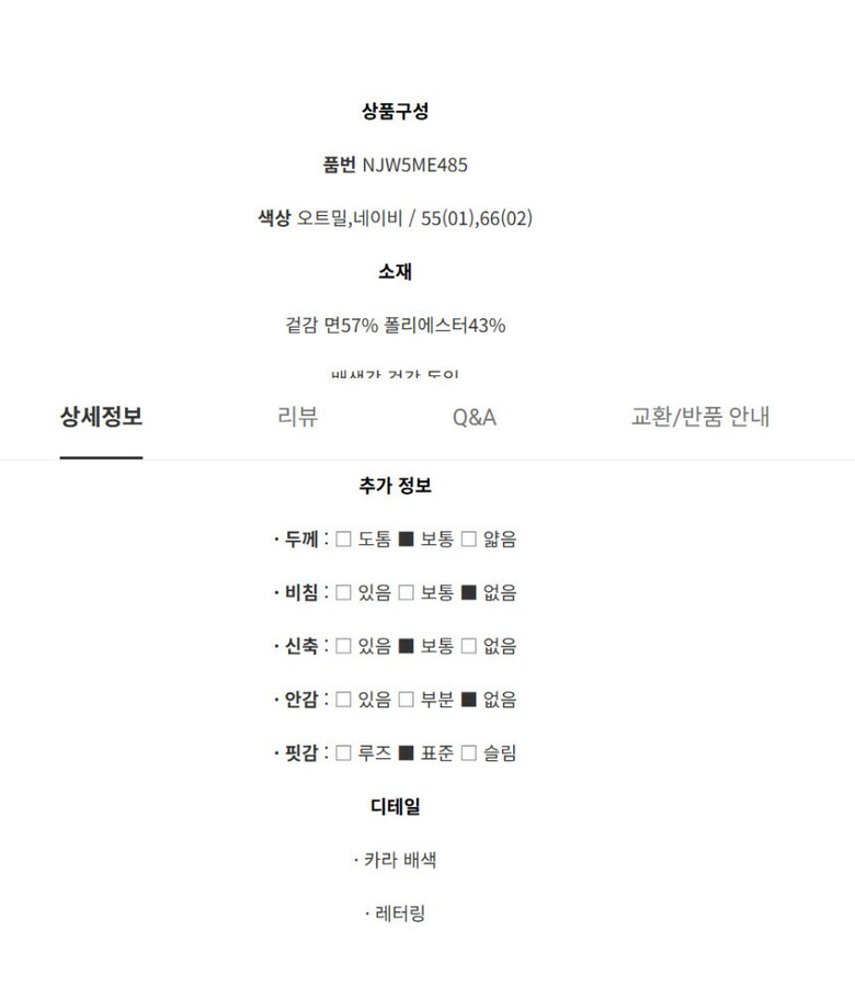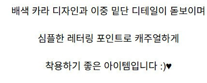 | 1. 제품 소재 (섬유의 조성 또는 혼용률을 백분율로 표시, 기능성인 경우 성적서 또는 허가서) | 겉감 면57% 폴리에스터43% 배색감 겉감 동일 |