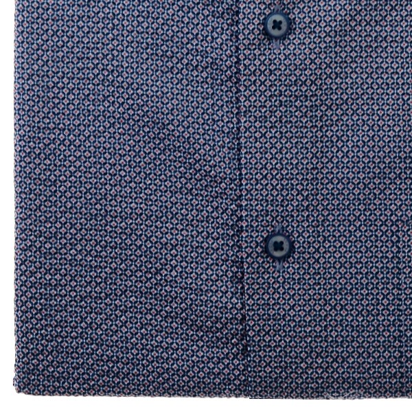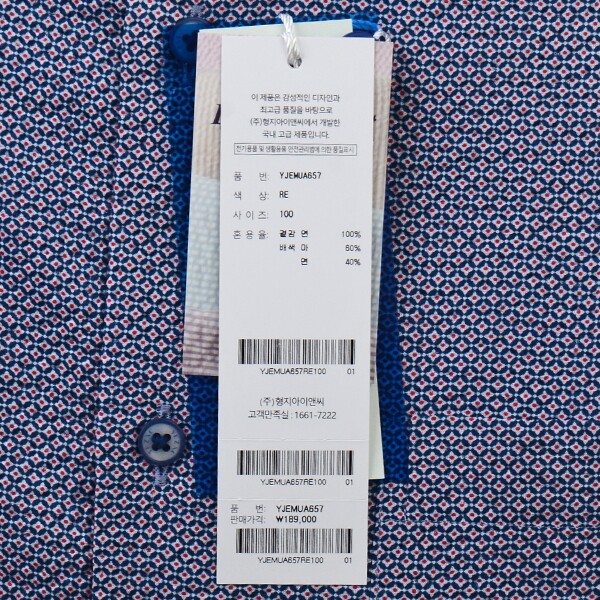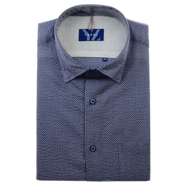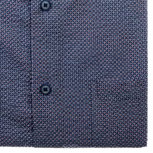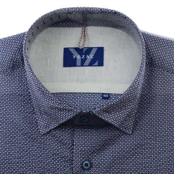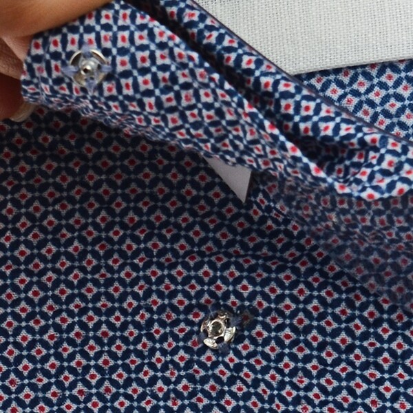 작은 기하학 문양과 네이비와 레드,화이트가 조화되어 멋스러운 경량 코튼 100 리플 써커 원단으로 천연섬유에 요철감을 준 소재로 매우 쾌적하고 착용감이 좋으며 다림질이 필요 없어 관리가 편한 카라에 스냅을 달고 밑단을 일자로 만들어 놓은 주머니가 없는 일반핏 반소매