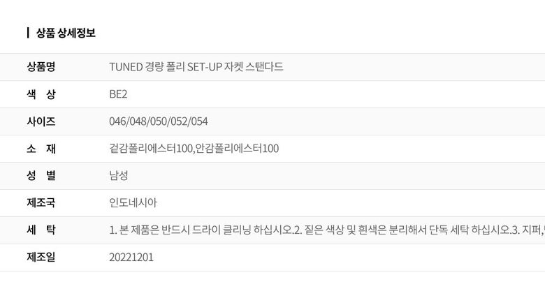 | 1. 제품 소재 (섬유의 조성 또는 혼용률을 백분율로 표시, 기능성인 경우 성적서 또는 허가서) | 겉감폴리에스터100,안감폴리에스터100 |