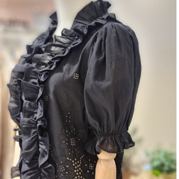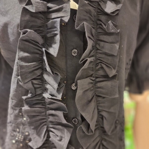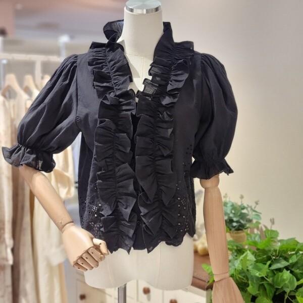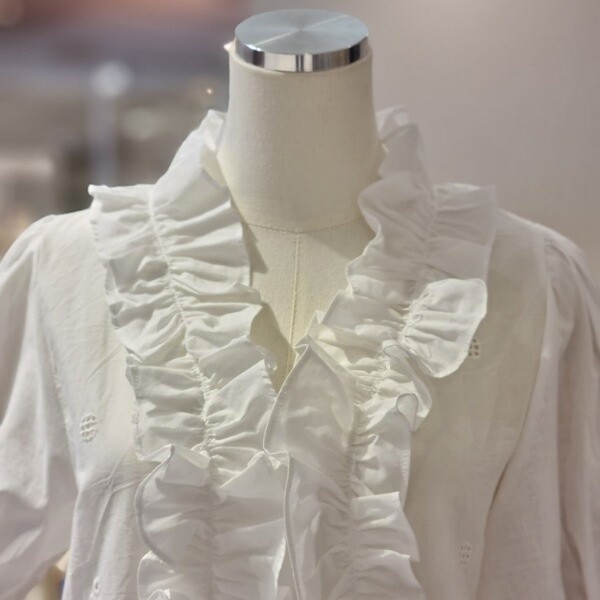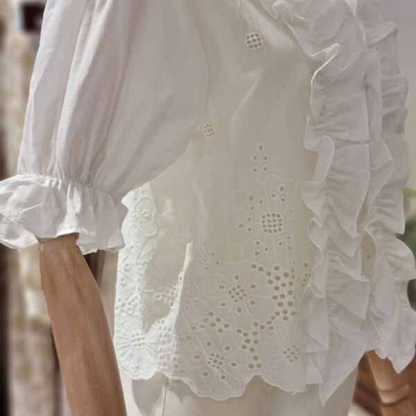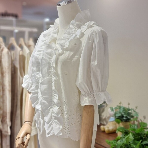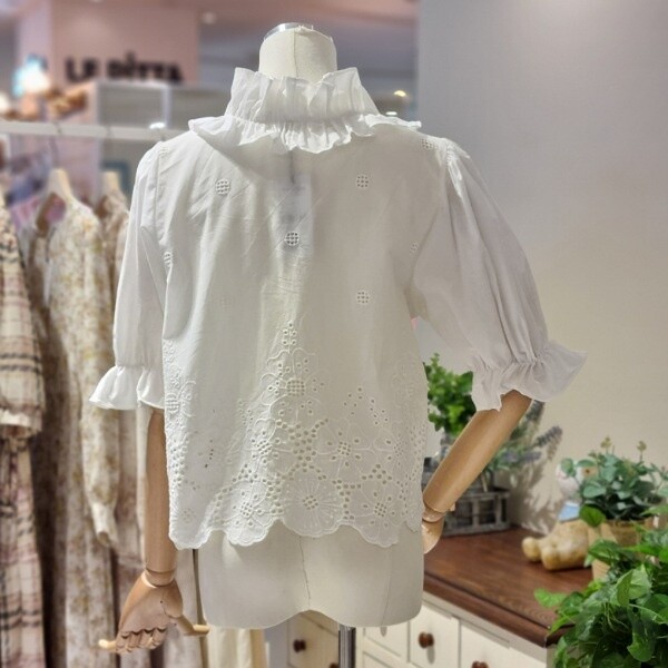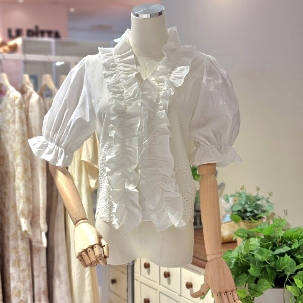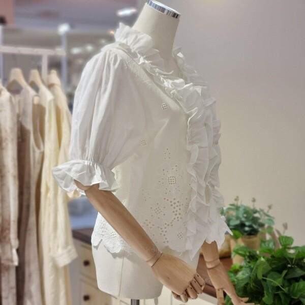 사랑스런 무드의 숄카라 프릴 블라우스면100%자수의 페미닌 무드 셔링 처리로 퍼프형 소매 가볍고 시원한 소재