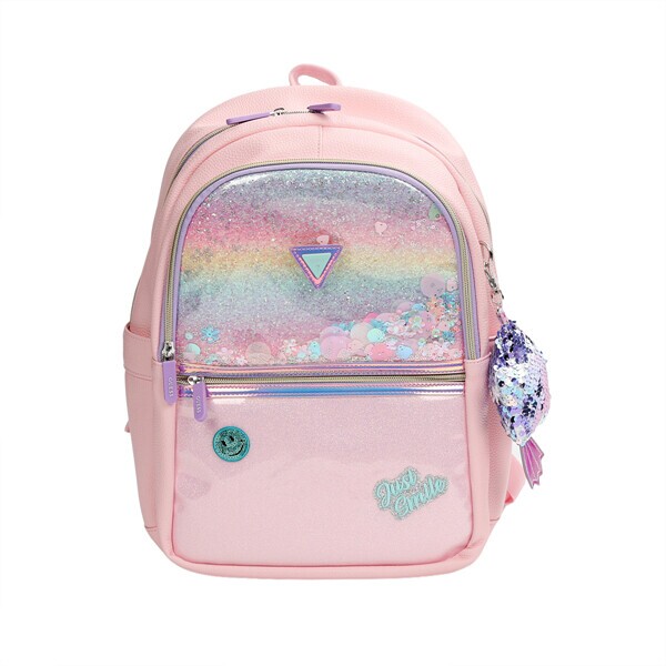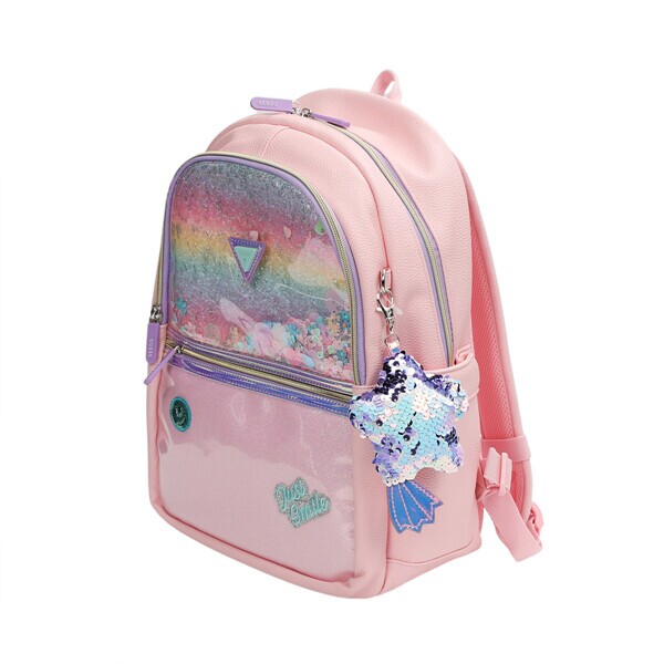 - 화려한 컬러 조합에 떨어지는 스팽글이 사랑스러운 재미있는 요소가 있는 신학기 책가방입니다