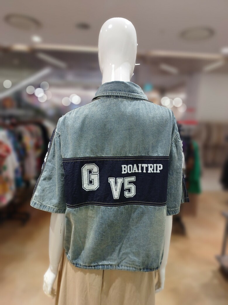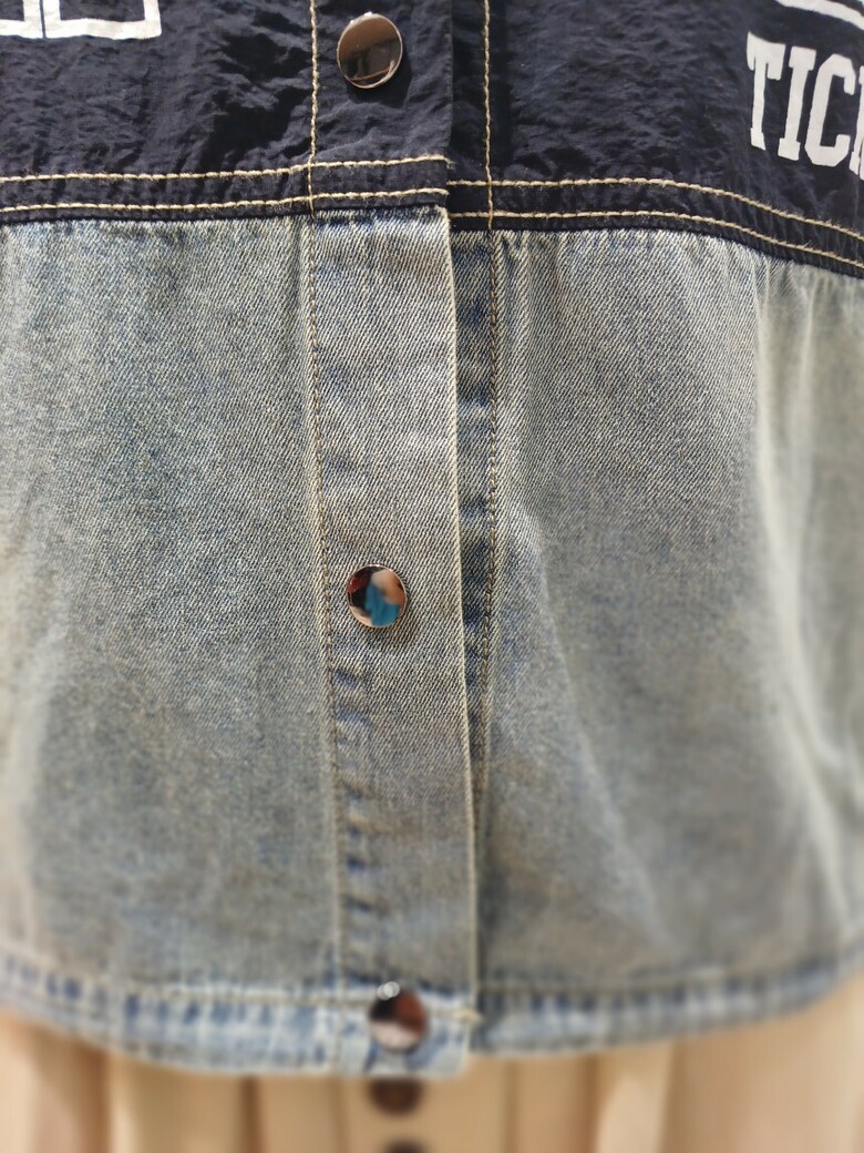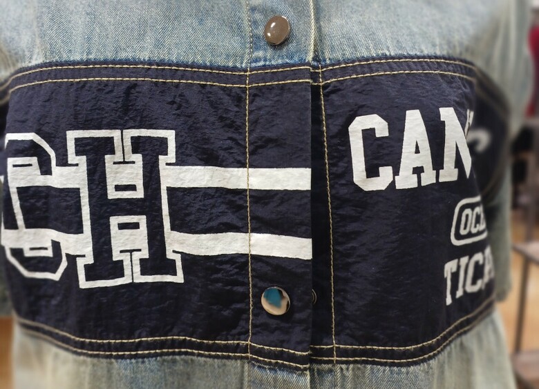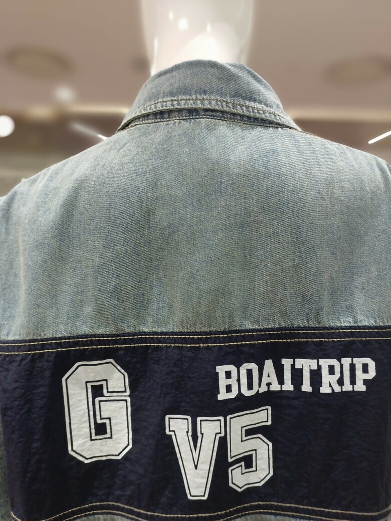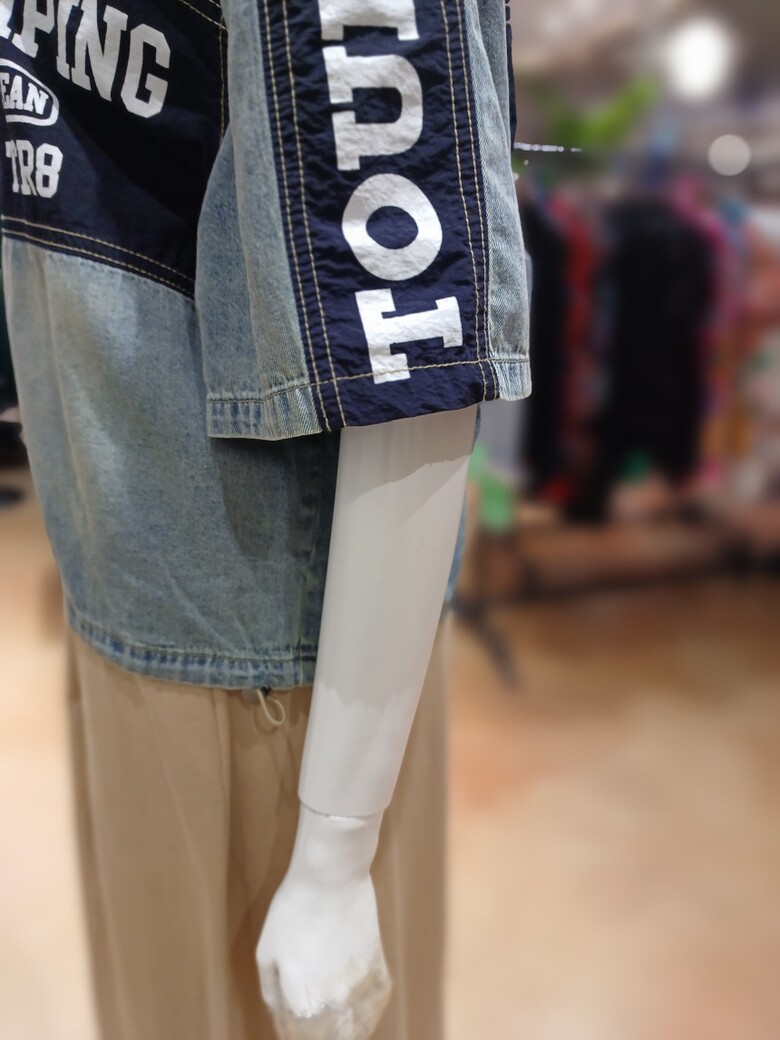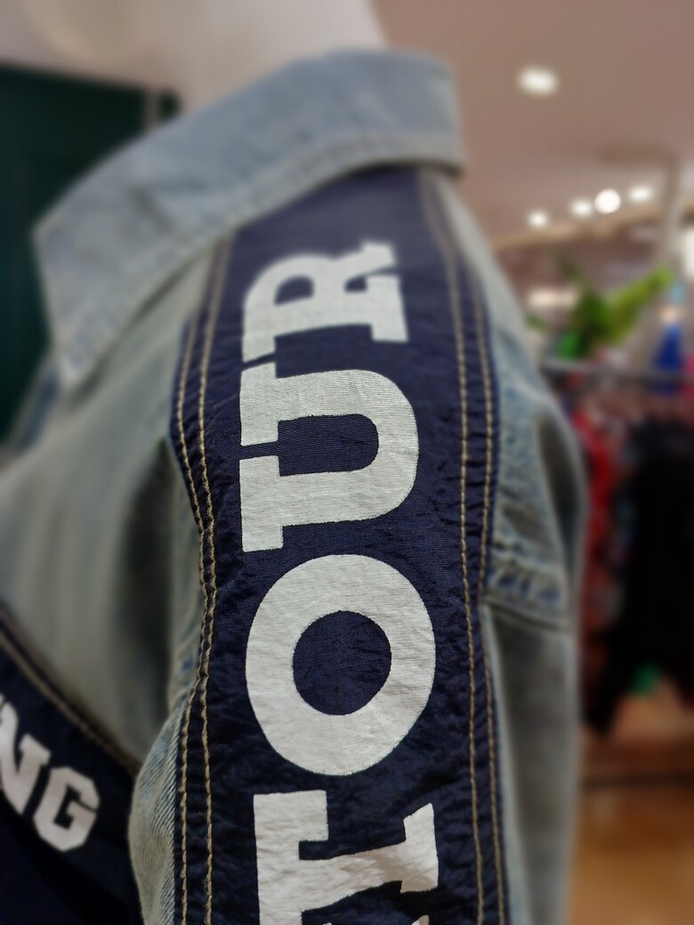 레터링 배색 청 우븐 자켓입니다