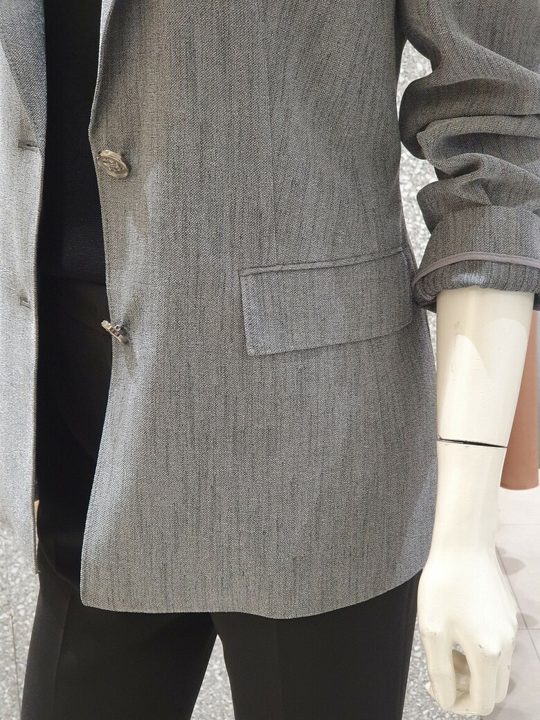 여밈 라인 싱글 투 버튼 클로징으로 간결한 재킷입니다.