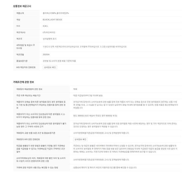 | 6. 세탁방법 및 취급시 주의사항 | 상품상세참조 |