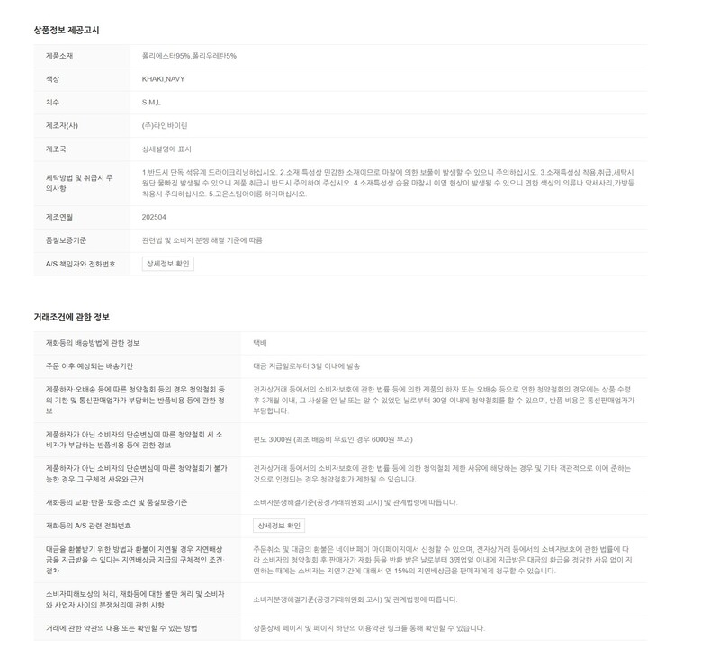 | 6. 세탁방법 및 취급시 주의사항 | 상품상세참조 |