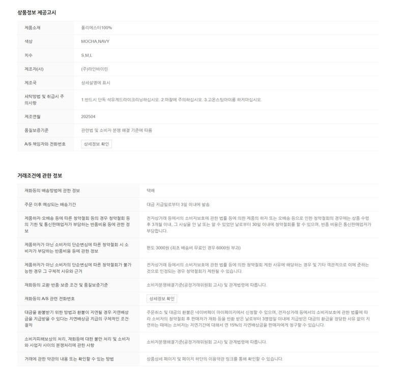 | 6. 세탁방법 및 취급시 주의사항 | 상품상세참조 |