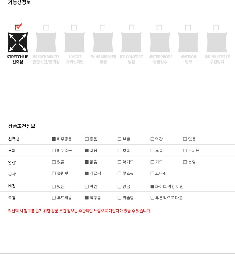 1. 제품 소재 (섬유의 조성 또는 혼용률을 백분율로 표시, 기능성인 경우 성적서 또는 허가서) 상세설명참고
