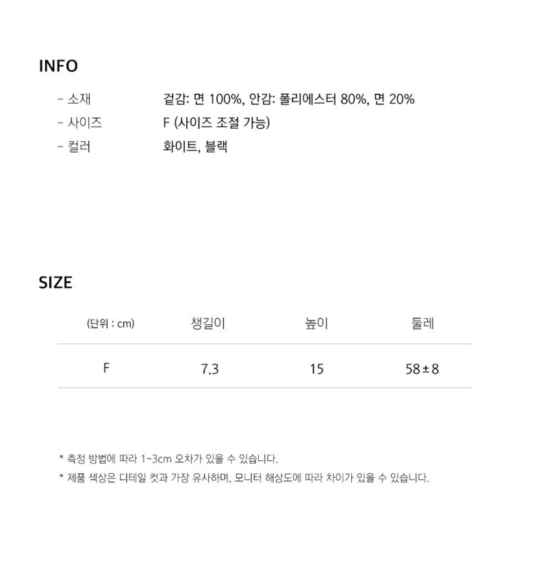 안정감있게 착용 가능한 넓은 둘레와 길이감이 특징이며 모자 뒷면 금속버클로 사이즈 조절하여 착용 할 수 있습니다.