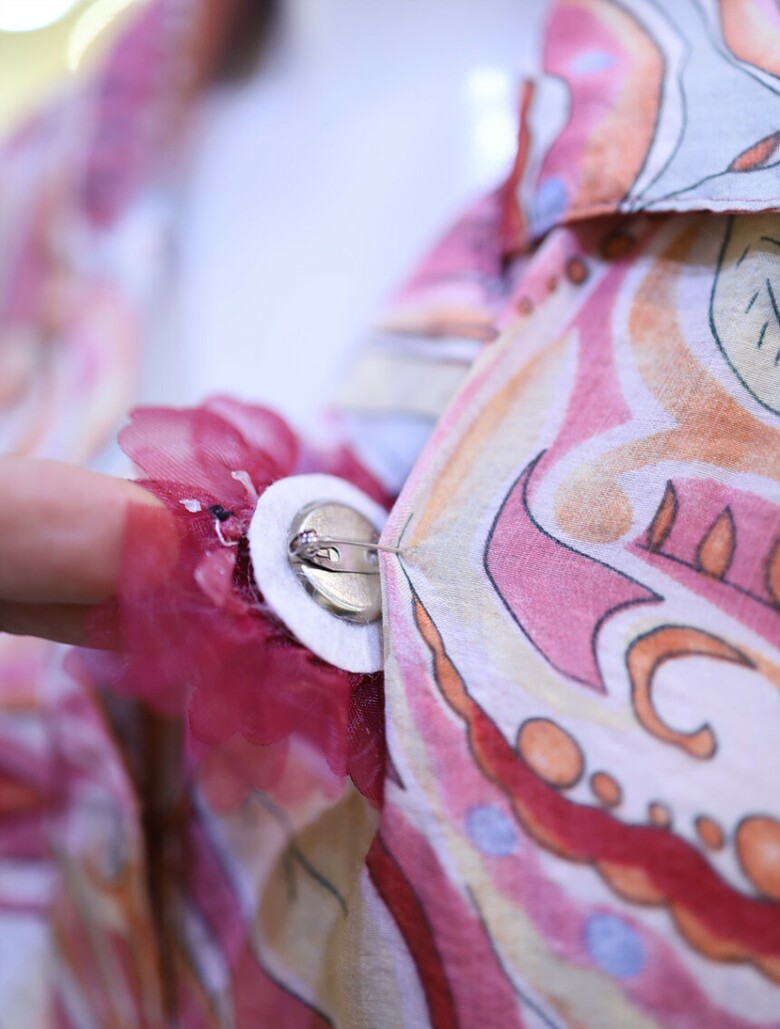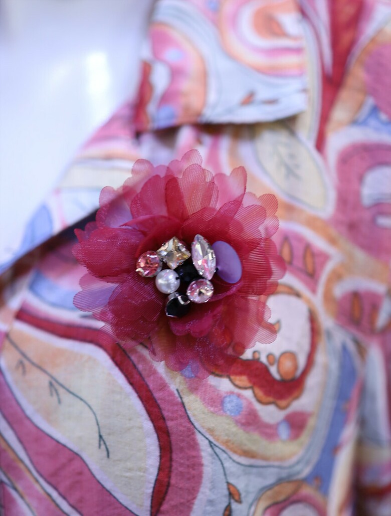 여성스러운 브로치로 룩의 완성도를 높여줍니다.