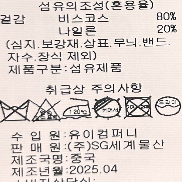 | 1. 제품 소재 (섬유의 조성 또는 혼용률을 백분율로 표시, 기능성인 경우 성적서 또는 허가서) | 겉감-비스코스80% 나일론20% |
