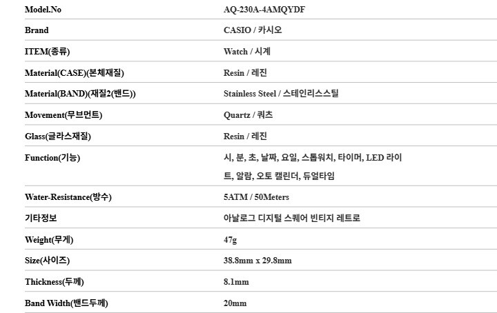 카시오 AQ-230A-4AMQYDF (AQ-230A-4A) 아날로그 디지털 스퀘어 빈티지 레트로 공용 메탈시계