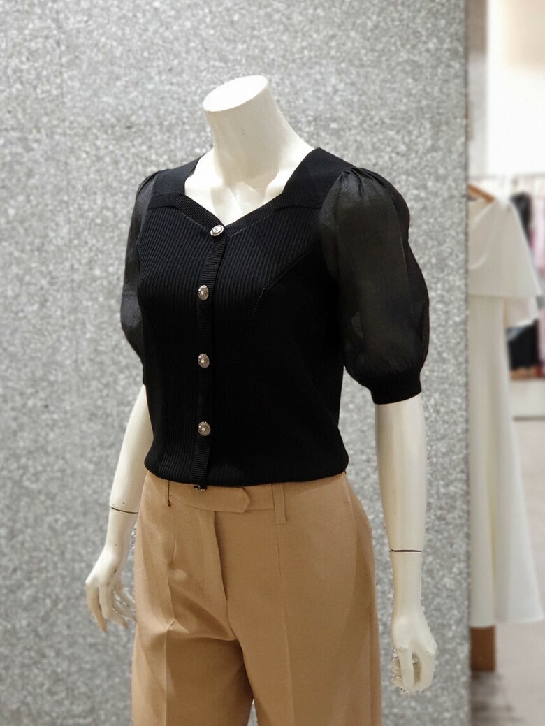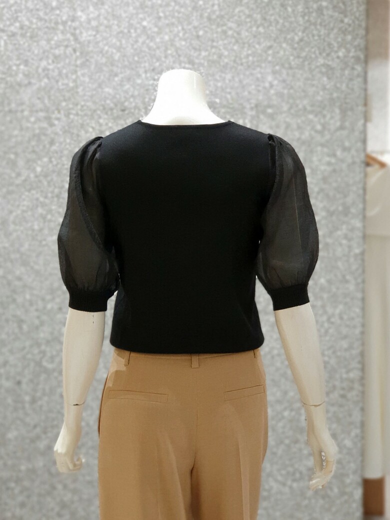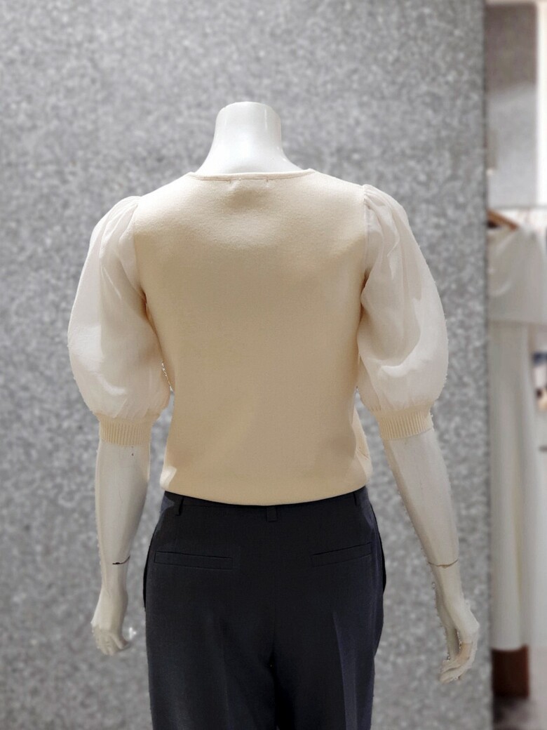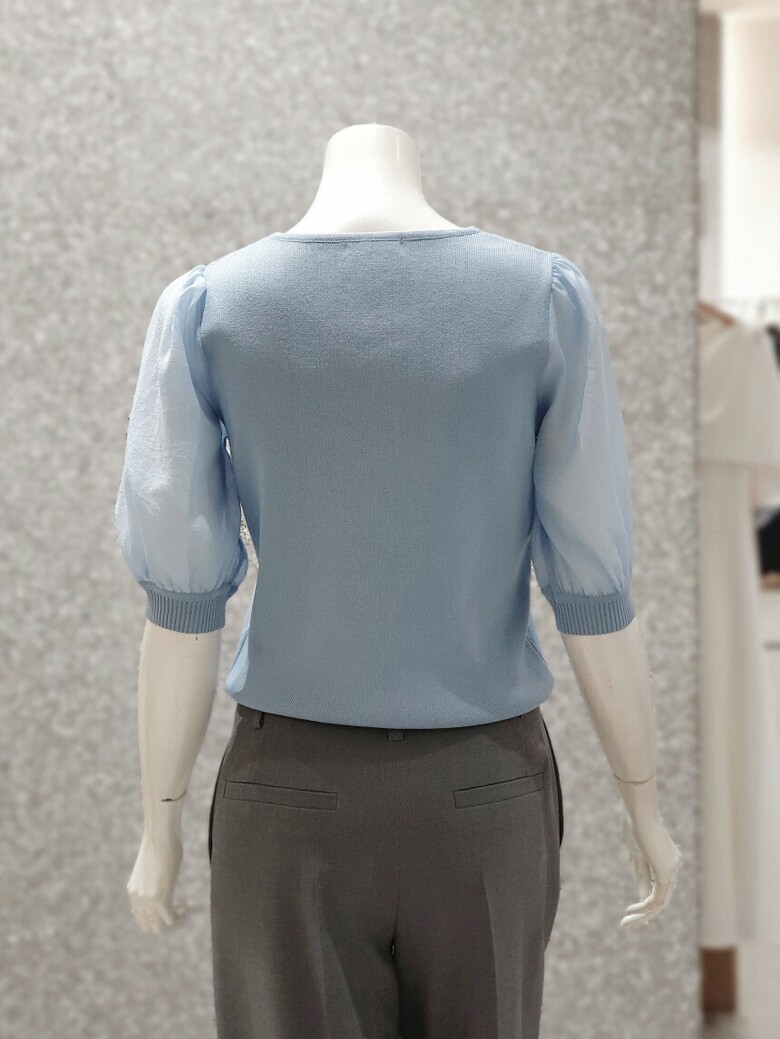 시스루 슬리브 배색으로 포인트를 준 풀오버 니트입니다.