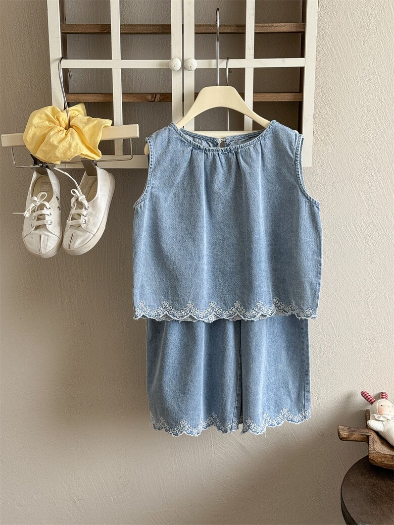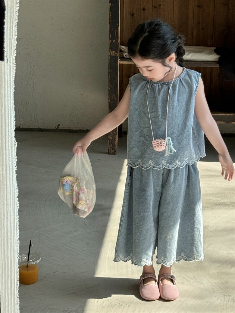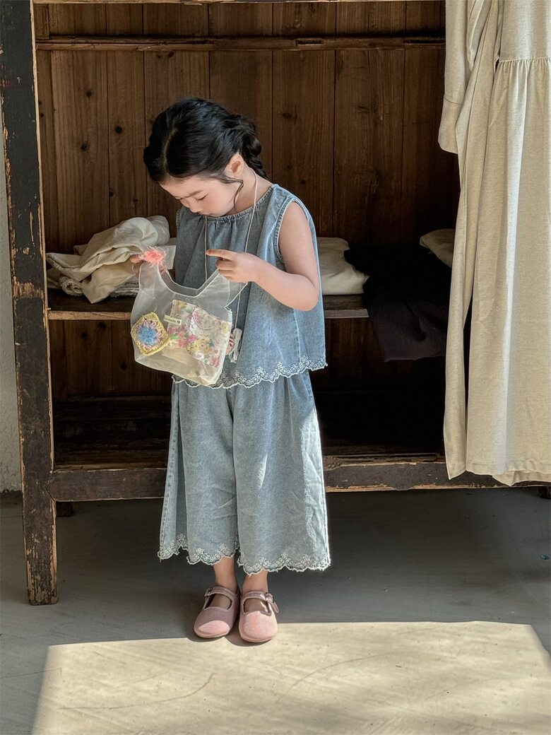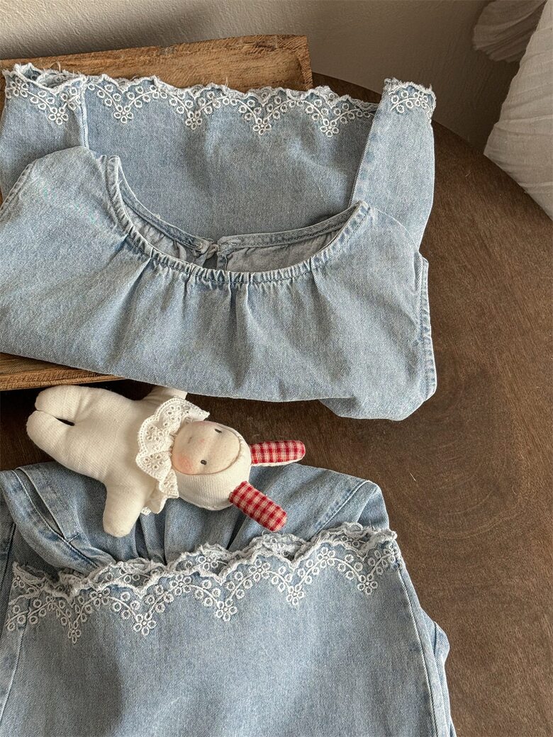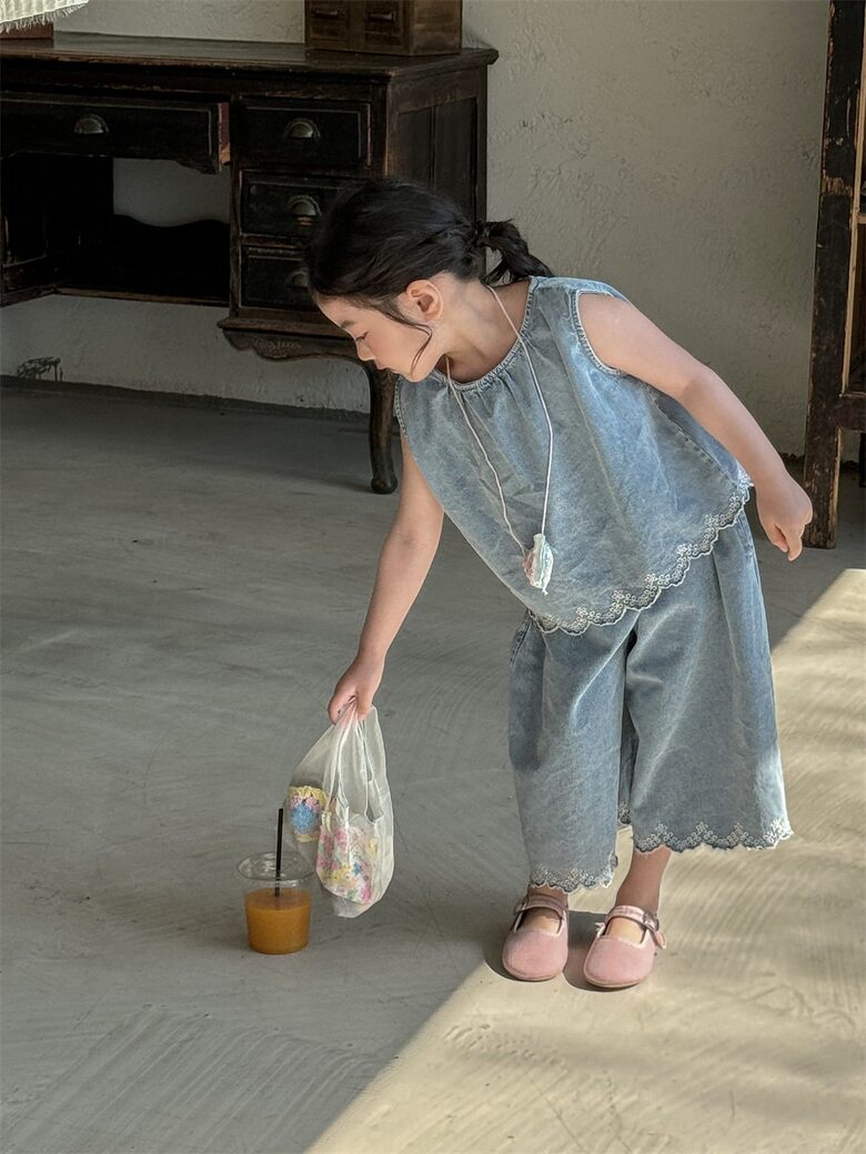 [예약발송] 물결 자수 데님 상하복 세트 R14383
