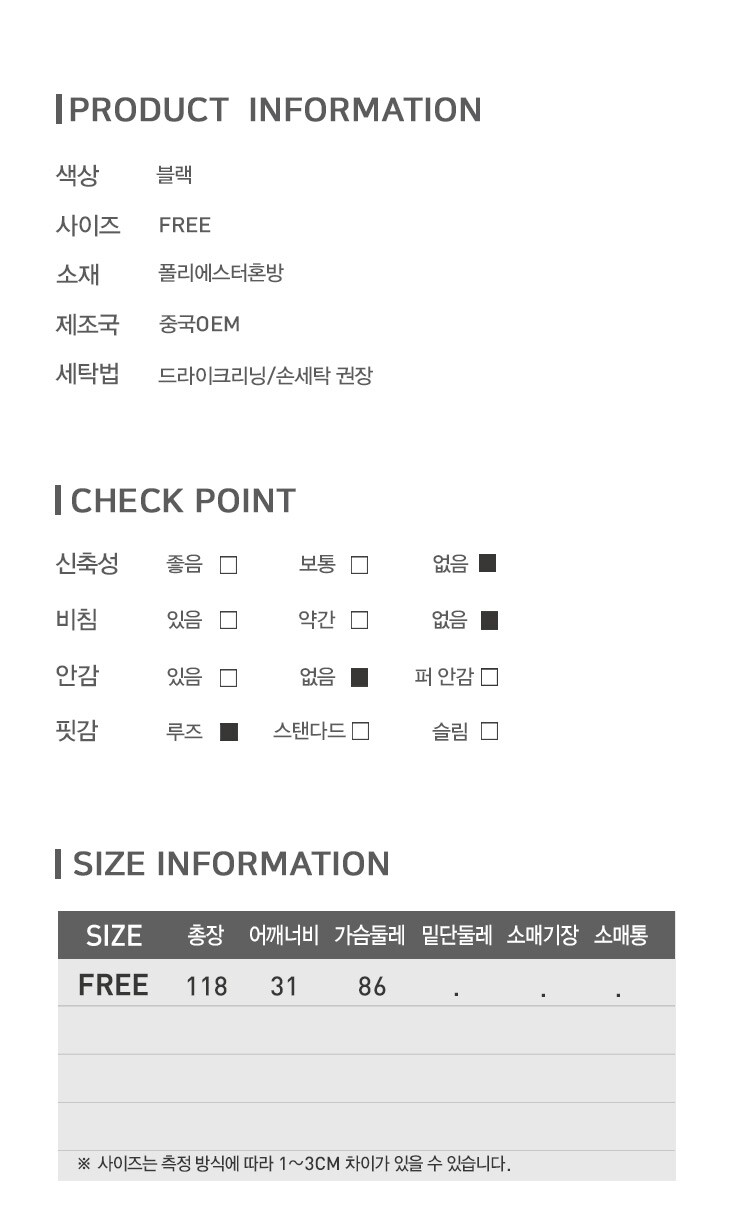 | 1. 제품 소재 (섬유의 조성 또는 혼용률을 백분율로 표시, 기능성인 경우 성적서 또는 허가서) | 상세페이지참고 |