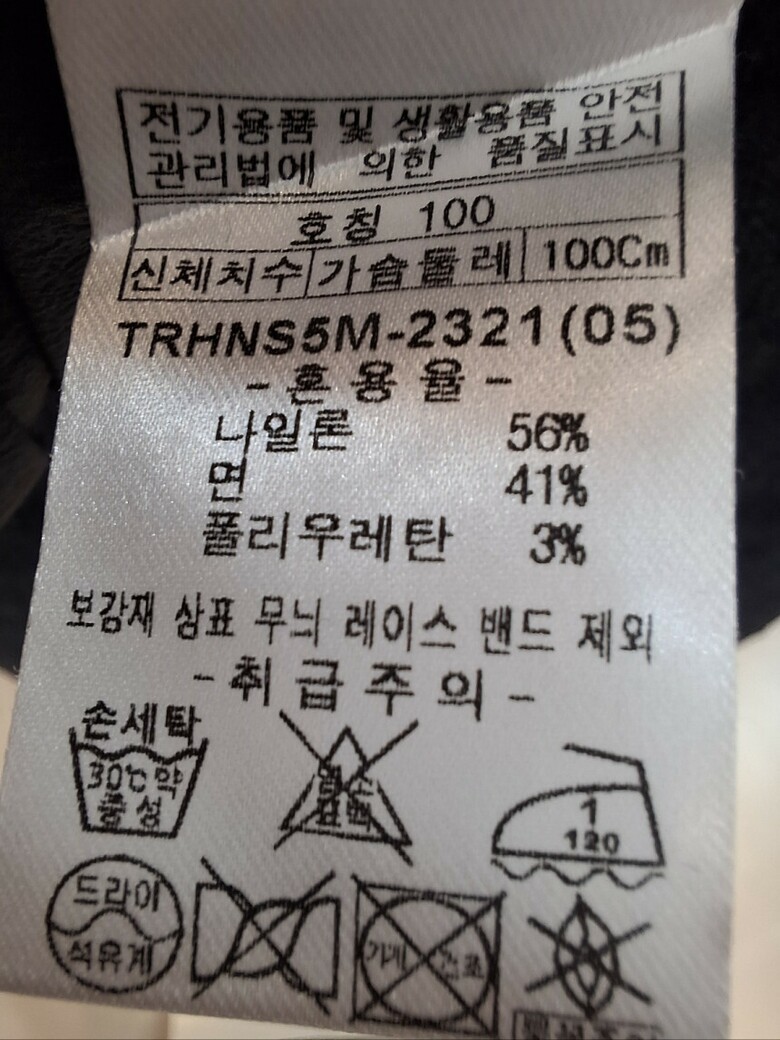 | 1. 제품 소재 (섬유의 조성 또는 혼용률을 백분율로 표시, 기능성인 경우 성적서 또는 허가서) | 나일론 56%, 면 41%, 폴리우레탄 3% |