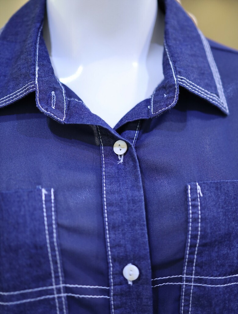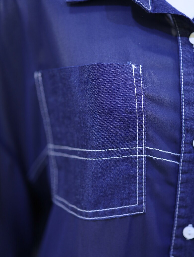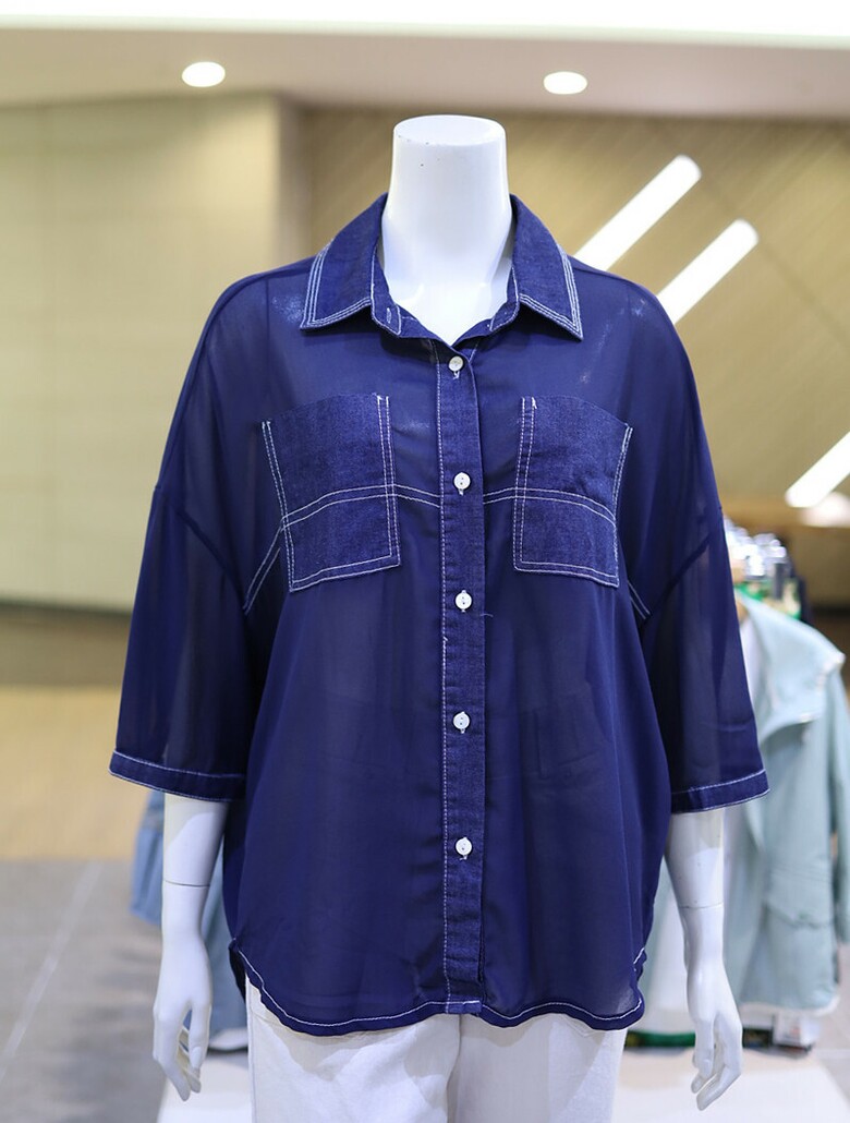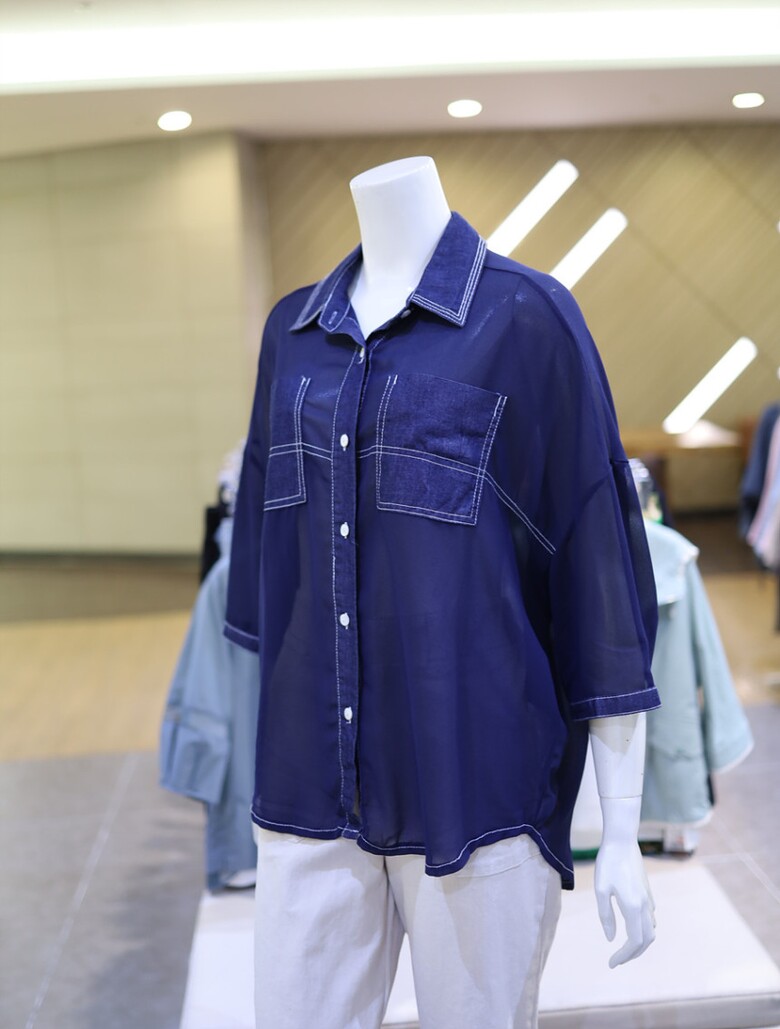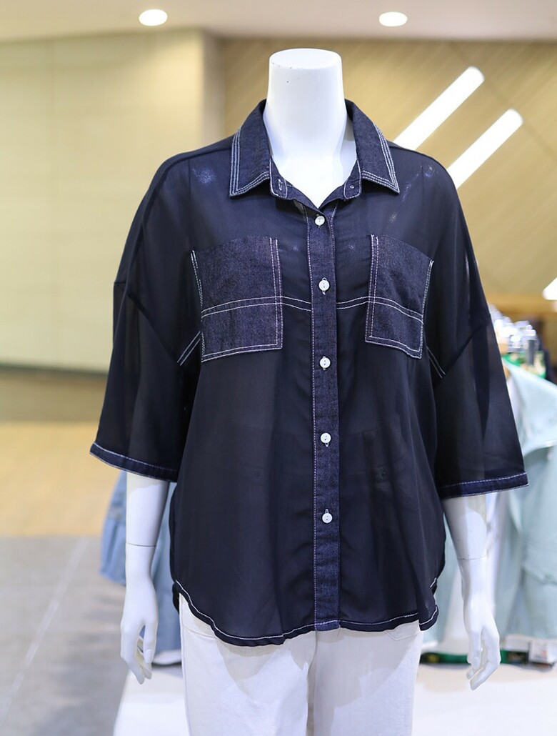 시스루한 소재와 데님 배색으로 유니크하면서도