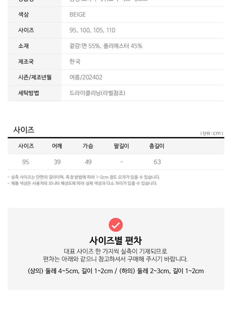 3. 치수 95사이즈실측기준 : 어깨39cm, 가슴49cm, 총길이63cm