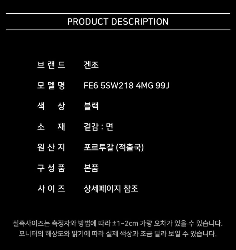 | 1. 제품 소재 (섬유의 조성 또는 혼용률을 백분율로 표시, 기능성인 경우 성적서 또는 허가서) | 상세페이지 참조 |