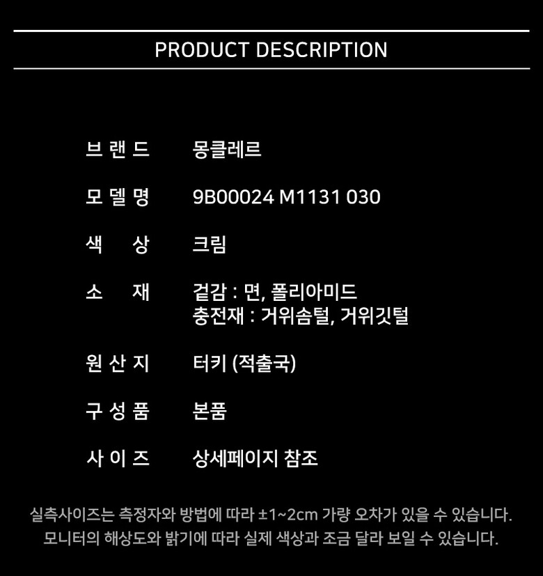 | 1. 제품 소재 (섬유의 조성 또는 혼용률을 백분율로 표시, 기능성인 경우 성적서 또는 허가서) | 상세페이지 참조 |