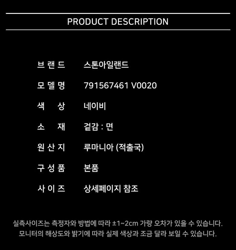 | 1. 제품 소재 (섬유의 조성 또는 혼용률을 백분율로 표시, 기능성인 경우 성적서 또는 허가서) | 상세페이지 참조 |