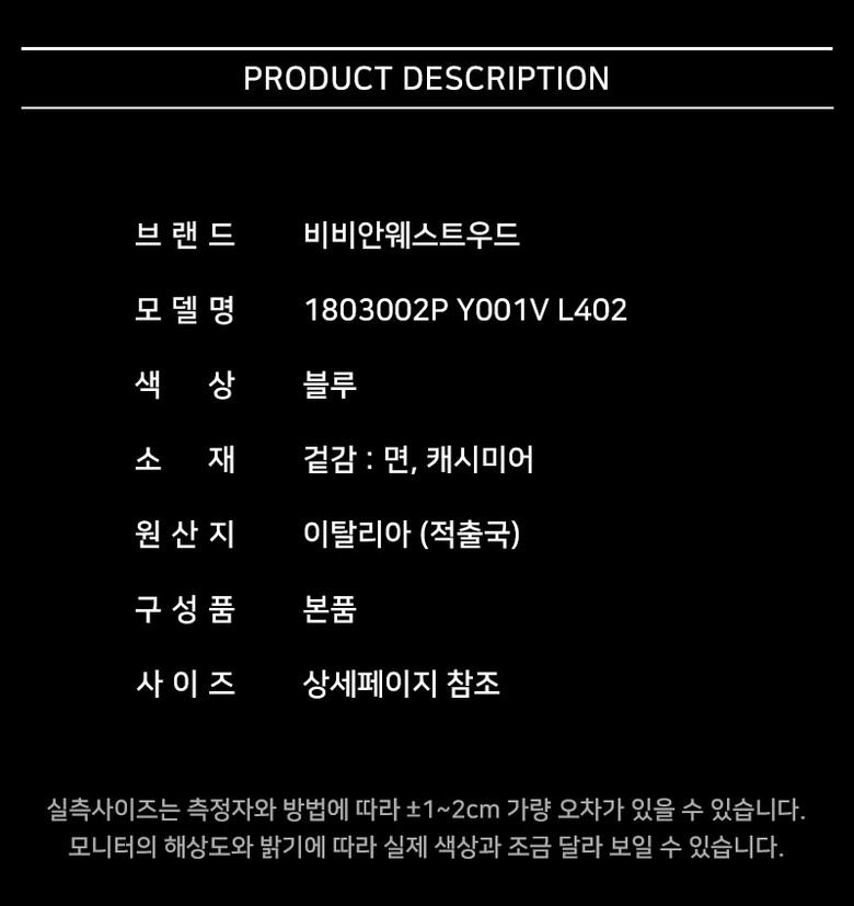| 1. 제품 소재 (섬유의 조성 또는 혼용률을 백분율로 표시, 기능성인 경우 성적서 또는 허가서) | 상세페이지 참조 |