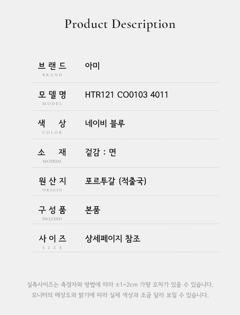 | 1. 제품 소재 (섬유의 조성 또는 혼용률을 백분율로 표시, 기능성인 경우 성적서 또는 허가서) | 상세페이지 참조 |