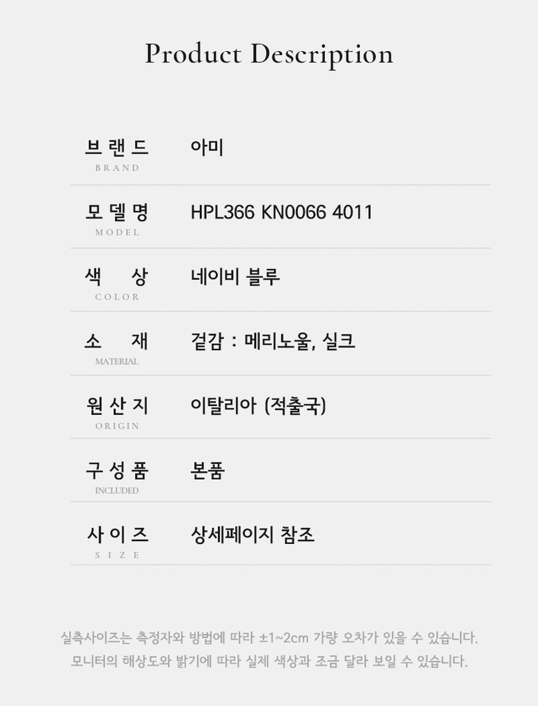 | 1. 제품 소재 (섬유의 조성 또는 혼용률을 백분율로 표시, 기능성인 경우 성적서 또는 허가서) | 상세페이지 참조 |