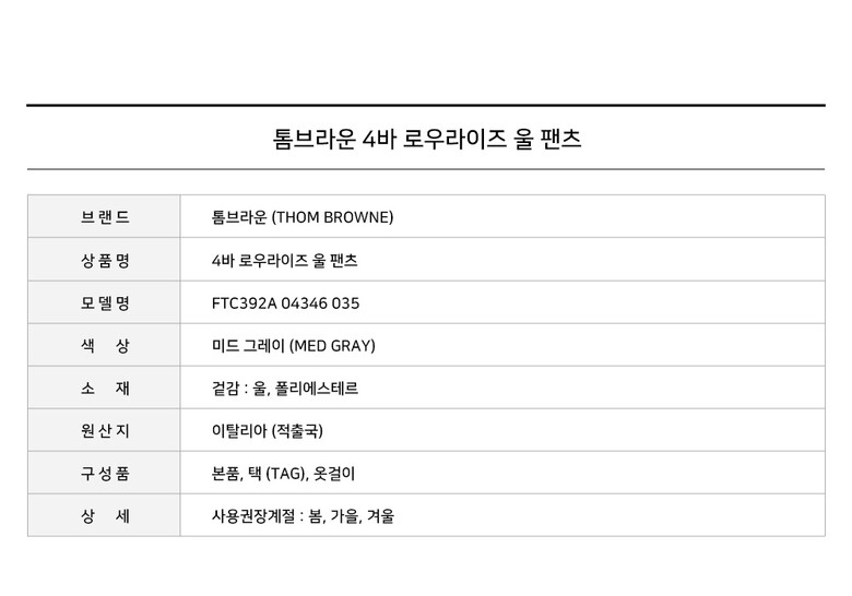 - #리본즈코리아 #FTC392A04346035 #[명품] #톰브라운 #4바 #로우라이즈 #울 #팬츠 #미드그레이 #FTC392A #04346 #035 #여성 #의류 #정장하의 #정장