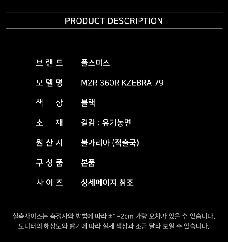 | 1. 제품 소재 (섬유의 조성 또는 혼용률을 백분율로 표시, 기능성인 경우 성적서 또는 허가서) | 상세페이지 참조 |