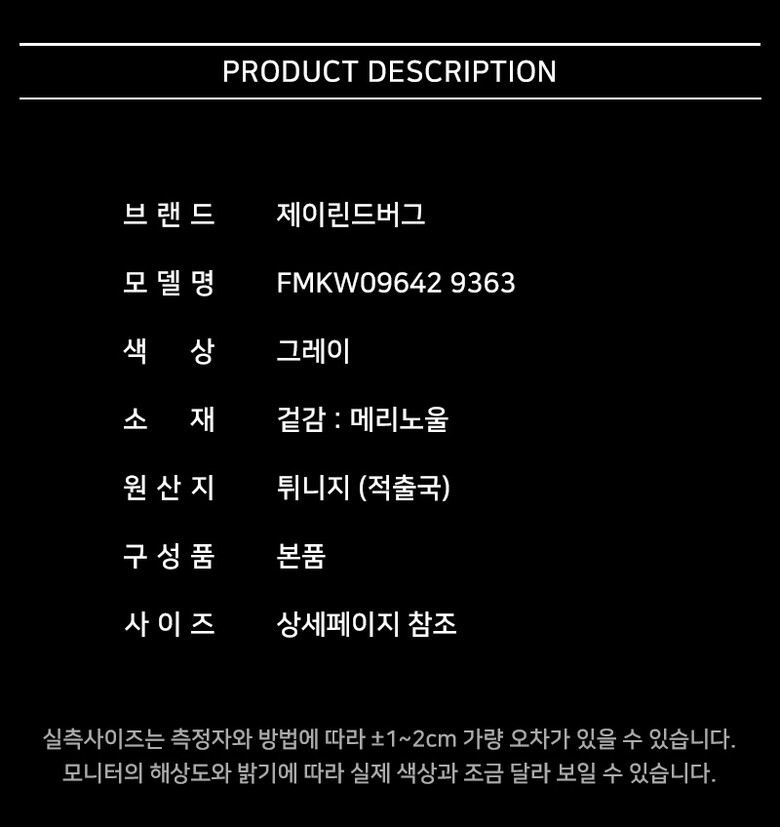 | 1. 제품 소재 (섬유의 조성 또는 혼용률을 백분율로 표시, 기능성인 경우 성적서 또는 허가서) | 상세페이지 참조 |