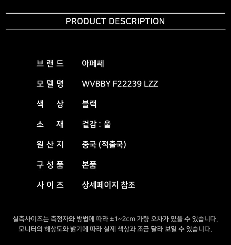 | 1. 제품 소재 (섬유의 조성 또는 혼용률을 백분율로 표시, 기능성인 경우 성적서 또는 허가서) | 상세페이지 참조 |