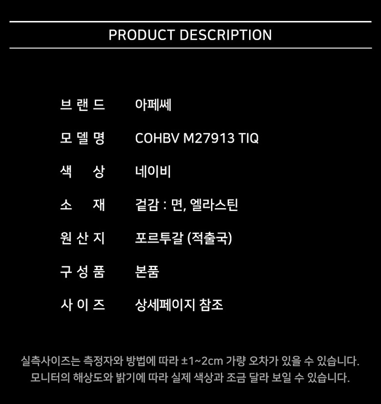 | 1. 제품 소재 (섬유의 조성 또는 혼용률을 백분율로 표시, 기능성인 경우 성적서 또는 허가서) | 상세페이지 참조 |
