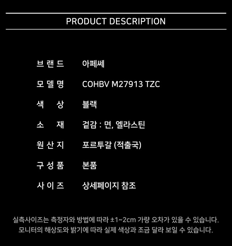 | 1. 제품 소재 (섬유의 조성 또는 혼용률을 백분율로 표시, 기능성인 경우 성적서 또는 허가서) | 상세페이지 참조 |