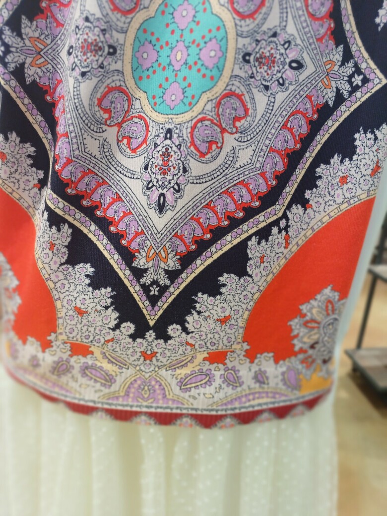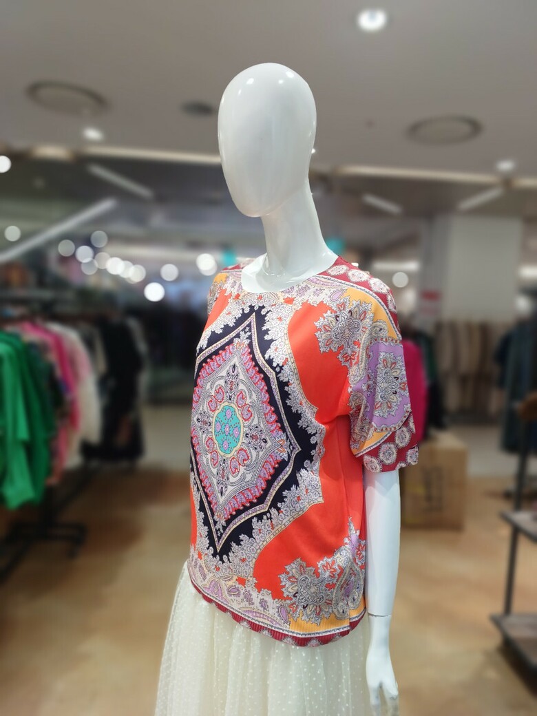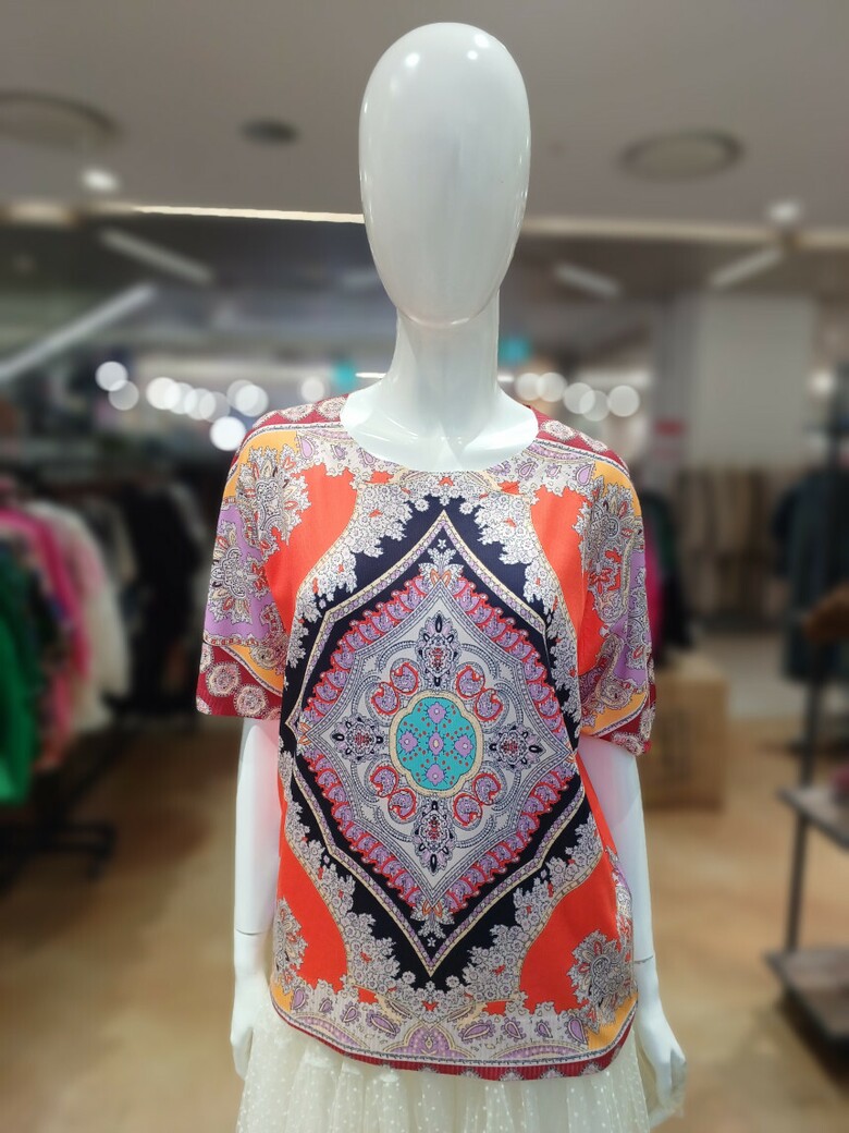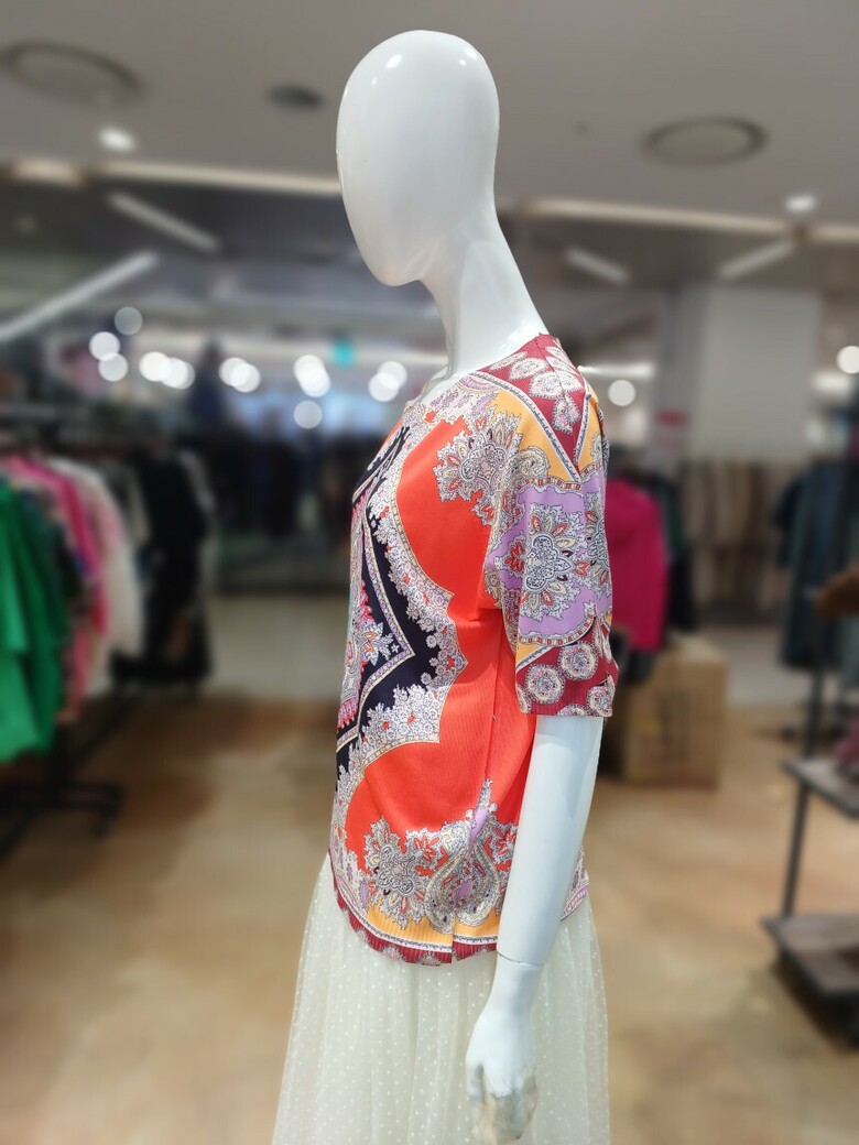 화사한 프린트가 포인트인 라운드넥 반팔 니트입니다