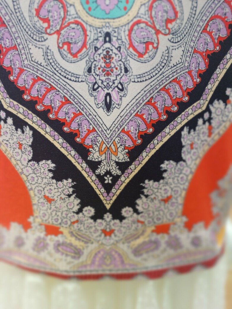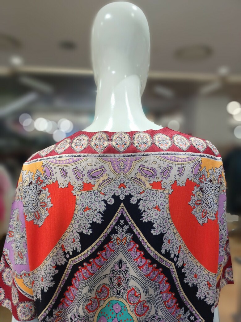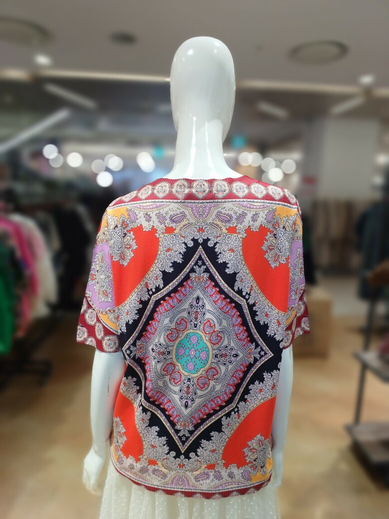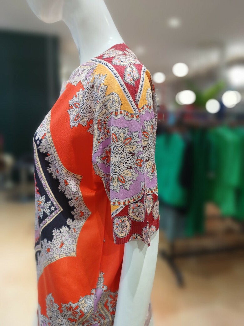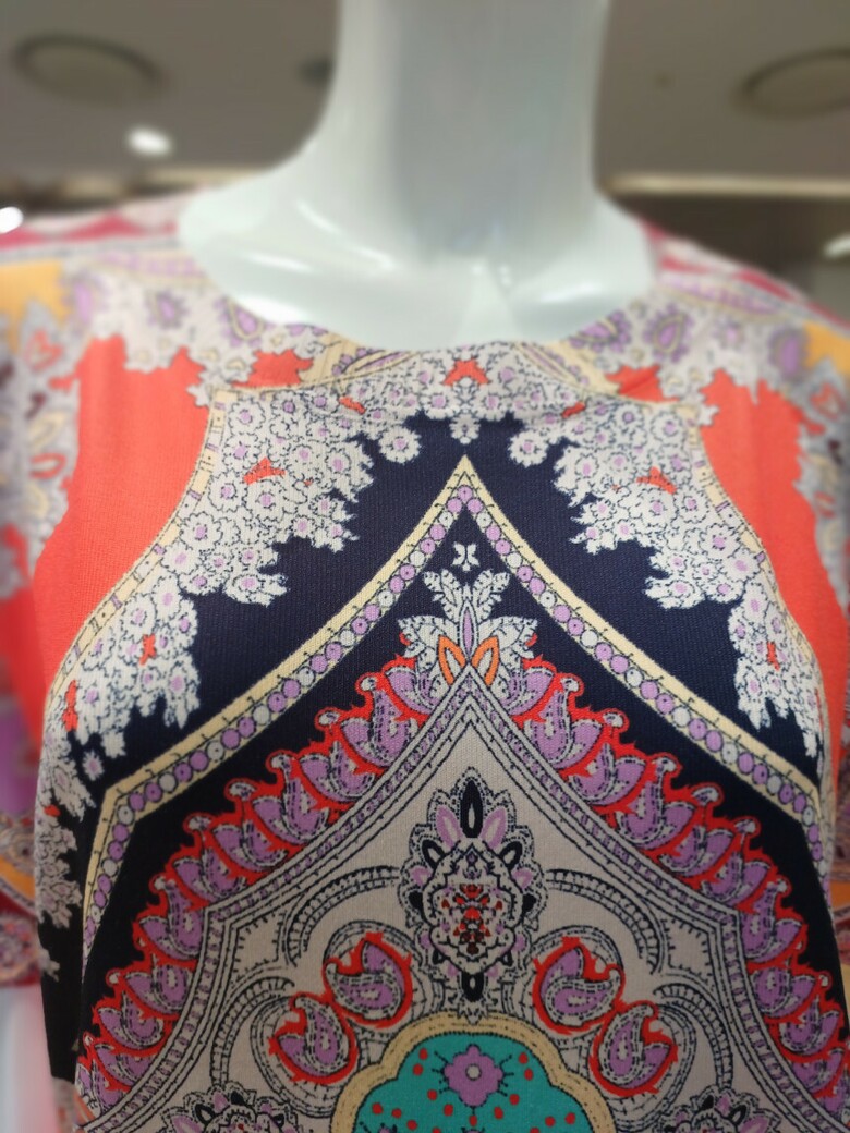 화사한 프린트가 포인트인 라운드넥 반팔 니트입니다