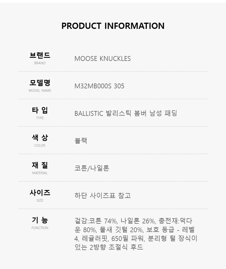 [명품] 무스너클 M32MB000S 305 BALLISTIC 발리스틱 봄버 남성 패딩