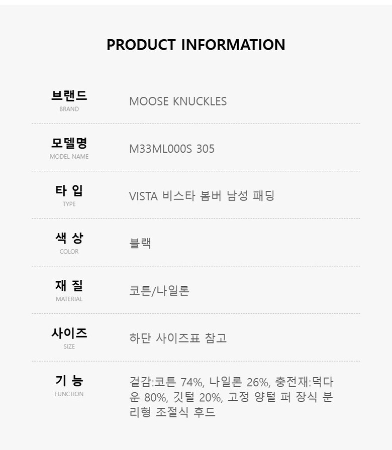 [명품] 무스너클 M33ML000S 305 VISTA 비스타 봄버 남성 패딩