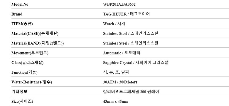 [명품] 태그호이어 WBP201A.BA0632 아쿠아레이서 오토매틱 남성 메탈시계