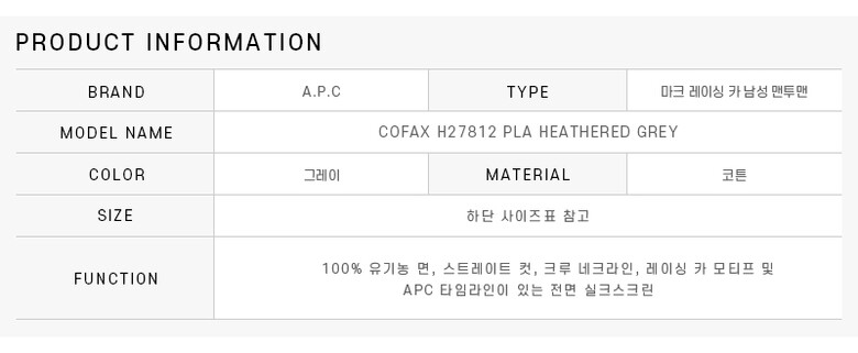 [명품] 아페쎄 COFAX H27812 PLA HEATHERED GREY MACK 맥 레이싱 카 남성 맨투맨